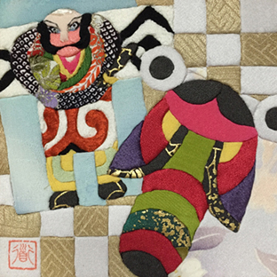 | 絹彩画 絹彩画はボードに着物裂を専用のヘラで極め込んでいく技法 | |